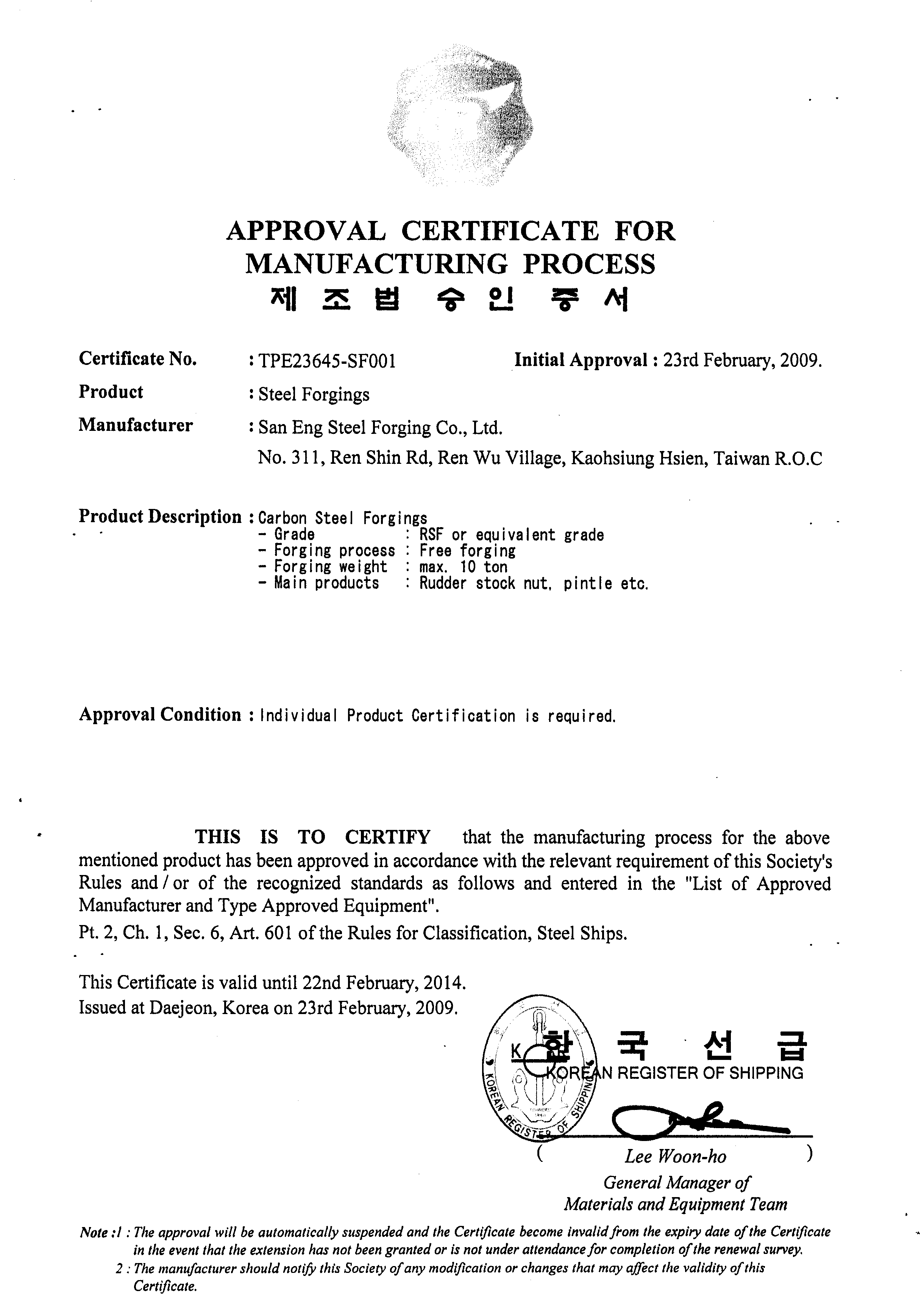 - Approval from Korean Register of Shipping
